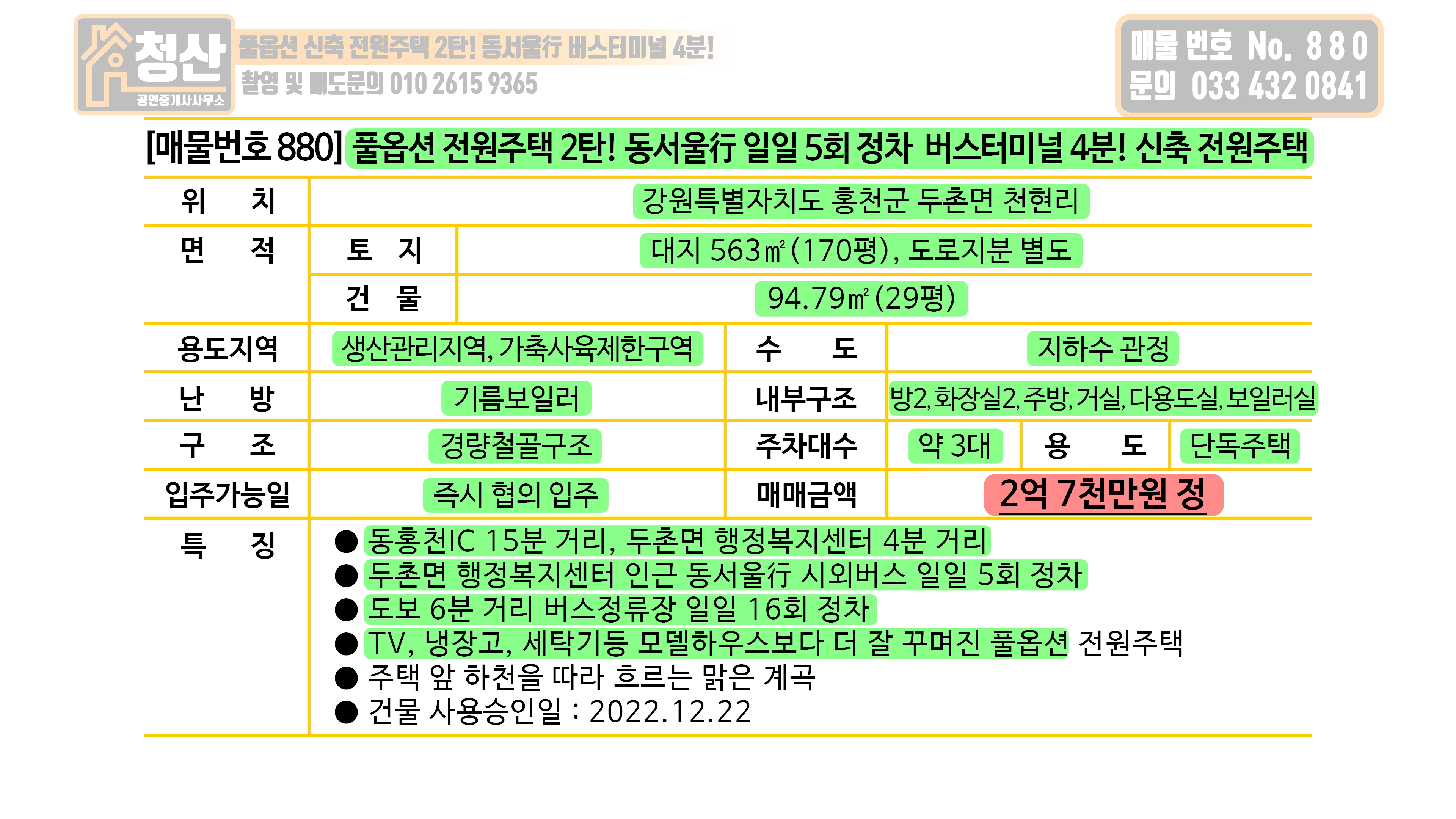 [매물번호 880] 풀옵션 전원주택 2탄! 두촌 신축 전원주택! 동서울행 버스터미널 4분, 도보 6분거리 홍천읍 행 버스정류장 16회 정차 홍천부동산 매매 매물